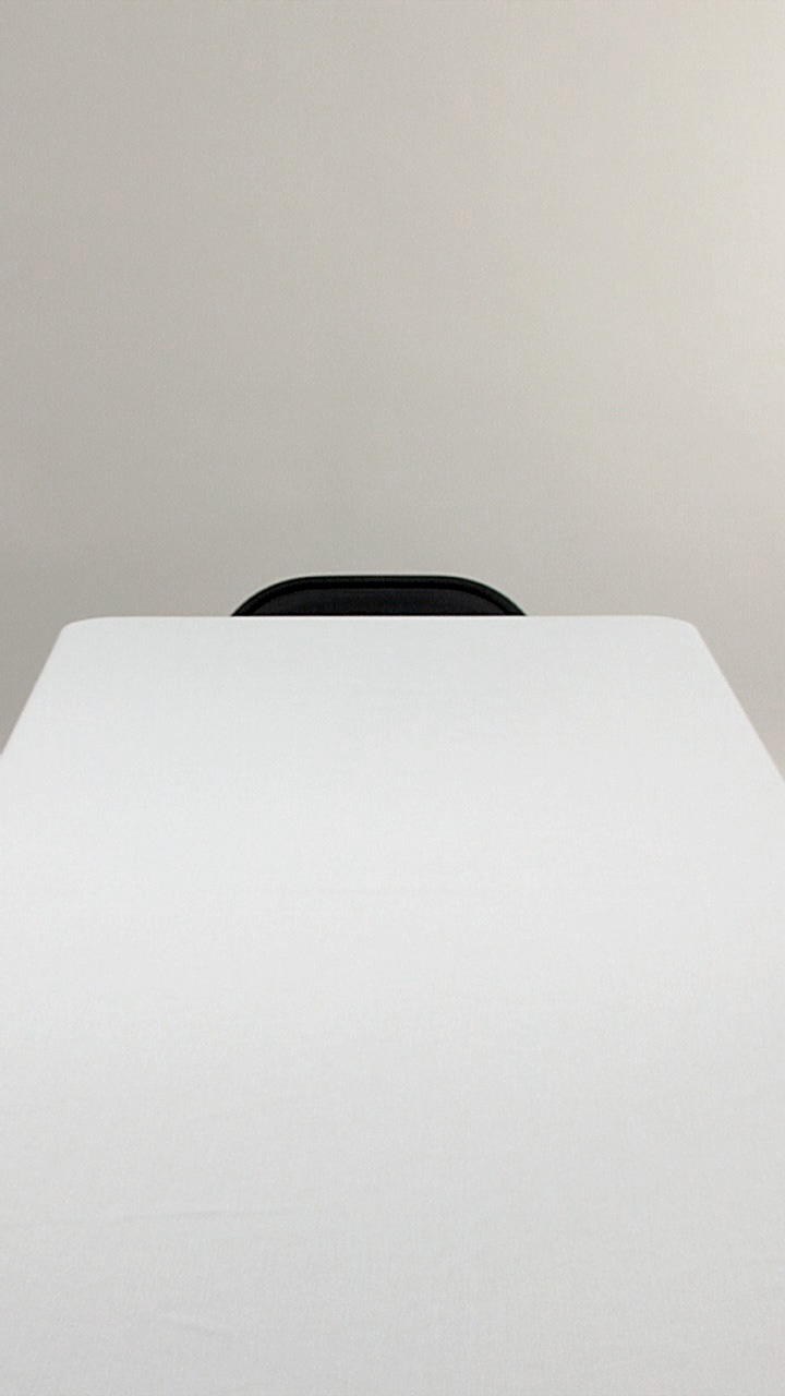 Seven-channel mono-audio, house paint on double-sided canvas in edition of seven, seven tables with linens, and chairs