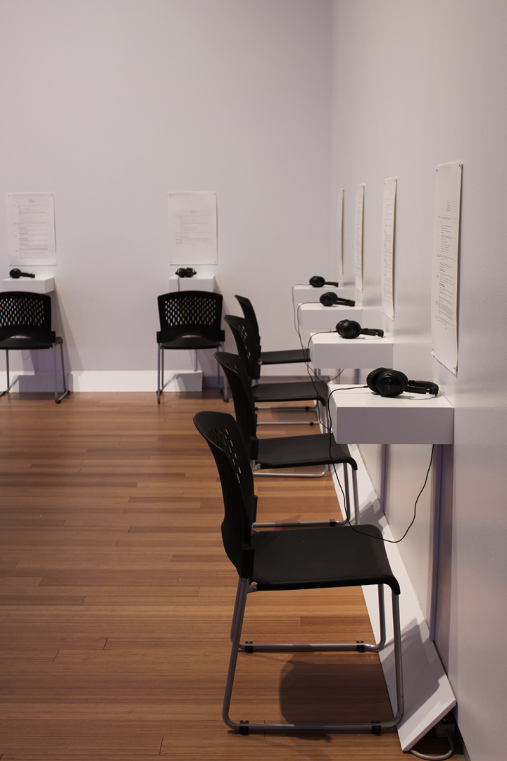 Seven-channel stereo-audio, seven wooden CD containers, chairs and seven limited edition hand-screened prints
