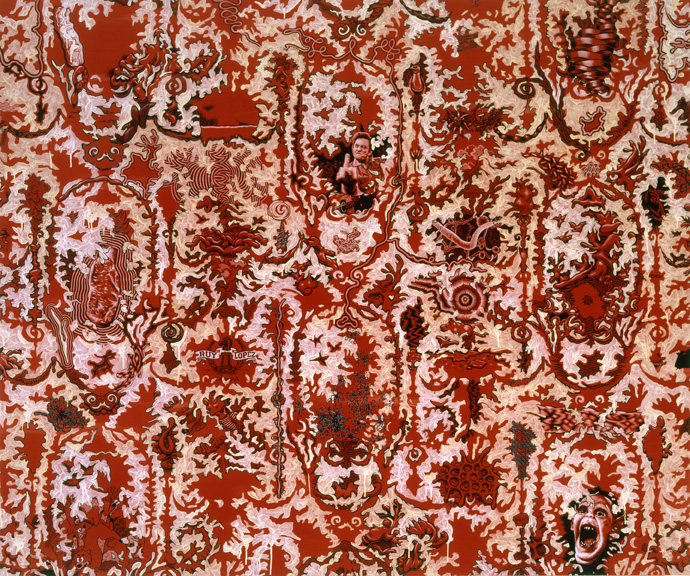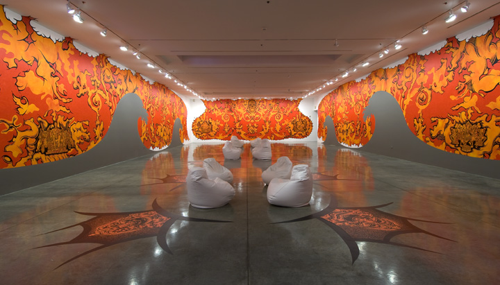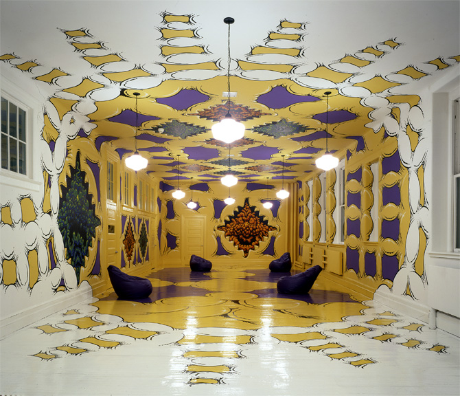 Acrylic and latex on walls, 7 india ink and acrylicÊpaintings on shaped PVC panels, vinyl decals on floor, and bean bag chairs