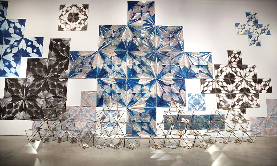 Nguyen's additive and intuitive process always results in wholes that are entirely at ease. Across her photographs and drawings, including those on view in the C.O.L.A. exhibition, salt crystals appear to grow out of Mylar, cyanotypes emerge and spread from the warp and weft of muslin cloth, and orb weavers' webs seem never to have not been colored after she has spray-painted them to black paper. It makes perfect sense that collecting constitutes a large part of her practice. Geodes, pinecones, coral, and samples of dirt and water from places near and far can be found in her studio, and sometimes, when the configuration of things seems right, are integrated into a sculpture or installation. There are no formulas here. Curiosity and wonder, above all, guide the artist as she works.