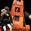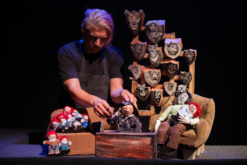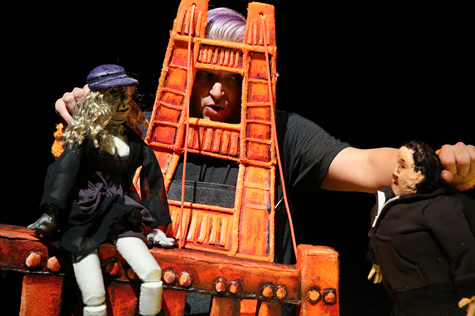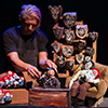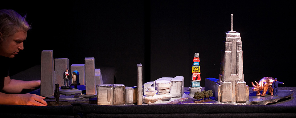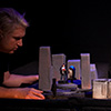 (In)/Animate Objects is the second half of a diptych on the relational world of De Lellis's fictional protagonist Andrea Lowe, an “objectum sexual” (a real psychological phenomenon in which a person develops romantic and sexual feelings for inanimate objects). Its companion piece, Object of Her Affection, is a solo puppetry performance that charts Andrea’s relationship history, from losing her virginity to a hunting rifle as an adolescent, to successive heartbreaks with a series of landmark statues, buildings, and bridges, until a final fatal encounter with a crumbling urban tenement. (2) Puppets and props shift scale throughout the performance, exteriorizing Andrea’s emotional vicissitudes, while De Lellis takes up multiple positions, at points serving simultaneously as narrator, character, and set piece. (In a feat of remarkable multidexterity, he manipulates both an Andrea puppet and her female nemesis Marcy while dressed as the Golden Gate Bridge.) Such polymorphic conversions are a playful invitation to childhood regression, a primal call to suspend the distinctions between subject and object, animate and inanimate, and self and other.