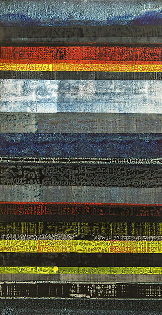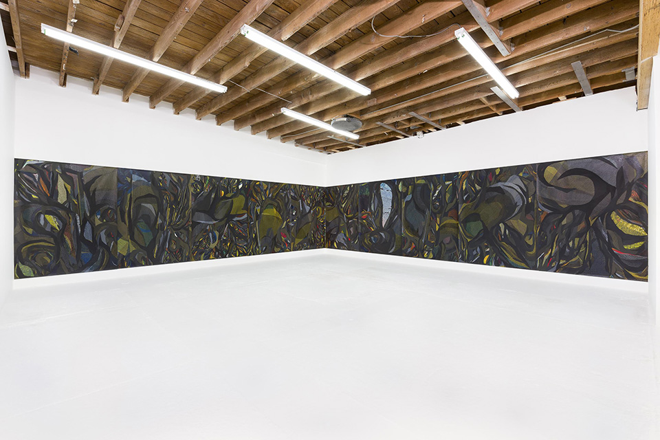 In 2015 Mukherjee exhibited Mutual Entanglements, composed of ten modular panels, each seven feet tall and five feet wide, at Los Angeles's Chimento Contemporary. The panels were conceived in relation to a standing human figure. The space was built around the exact dimensions of the piece so that the entire fifty feet would be folded at the center, forming two symmetrical twenty-five-foot segments. Though the title of the piece could easily refer to the colors—which seemed lifted from the natural world to depict a dense unnatural landscape created through the use of brooms, brushes, Q-tips, and cleaning products—the piece's placement in the gallery spoke to its inherent elasticity. No pattern was repeated or continued from panel to panel, and despite each panel's individuality within the piece, each existed with an inevitability that tied the work to the space in a closed universe. The work's ultimate cohesiveness created an air of suspension within the traditional white walls. Two panels were later shown as individual works, speaking to the work's adaptability.