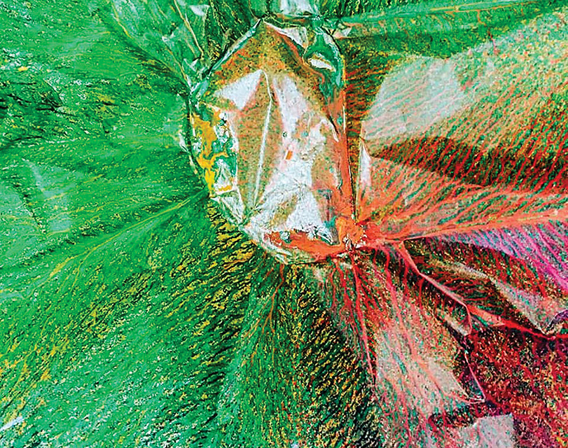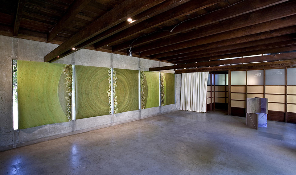 Mukherjee has made site-sensitive a verb. Perhaps stemming from his training as an engineer, his artistic work has an organic adaptability that speaks to its environment. Depending on the time of day or night and the viewer's position, the work becomes a membrane that keeps changing, an interface between inside and outside. Luminosity, opacity, color, materiality, texture—all are shifting properties of the work that have an innate architectonic rhythm. Gravity Folds (2016), Mukherjee's new work on view in the C.O.L.A. exhibition, extends the idea of site-sensitivity into performance. The panels have been used to lift his body off the ground in various positions, resulting in sculptural forms that will be installed on the wall as continuous shedding skin. The piece relates to the cantilevered balcony adjacent to the C.O.L.A. galleries, which overlooks the city.