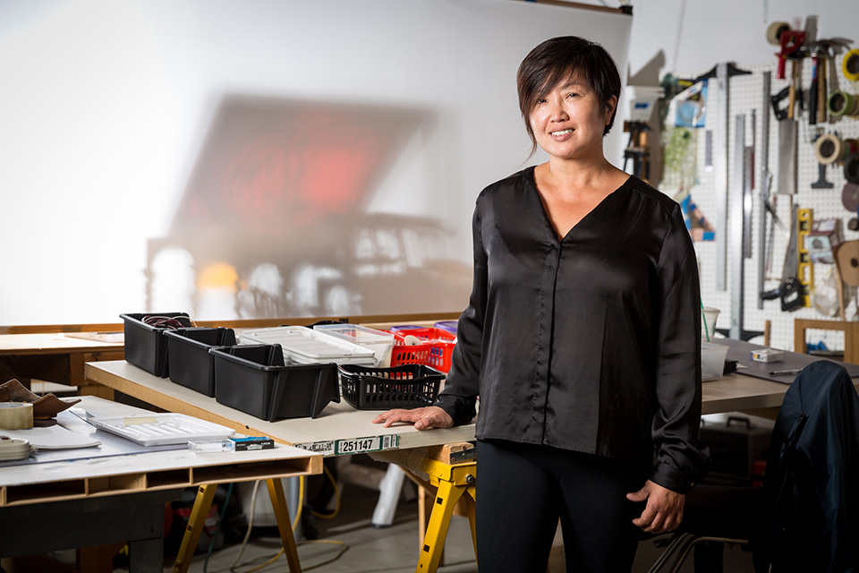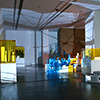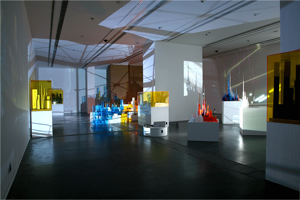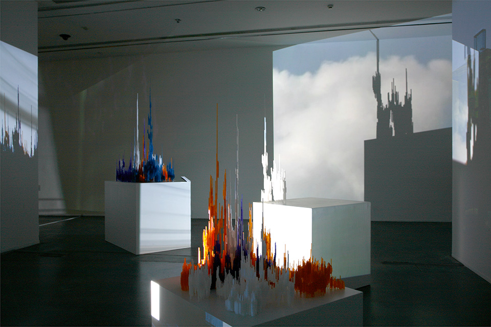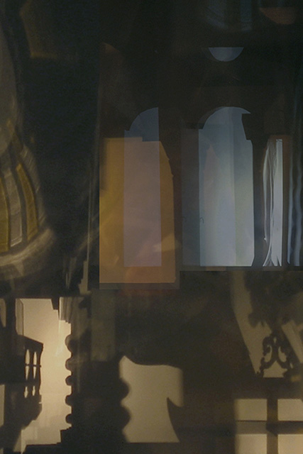 Won Ju Lim's installations are a confluence of sculpture, architecture, and cinema. It is an analogical relationship: her architectural structures are not just physical objects but are artifacts in which the object and the idea of the object coincide as one layer of experience, an exploration of meaning through temporal and spatial relationships. In addition, there is the phenomenological—that is, the experience of the subject in architecture, the experience of materiality, of light, of color, and of the psychological and physical relationship to space. In her past work Lim has used projected light and video on architectural structures made of colored Plexiglas, creating a liminal installation space that is completed when the viewer enters this immersive environment. The one-to-one relationship between the viewer, the sculpture, and the shadows that are created on the ceiling, walls, and floors is for her a theatrical experience: as the viewer moves, the surroundings shift into transitional states of spatial transformation and exchange between what is observed and what is real. Cinema serves as a metaphor for the hallucinatory nature of perception.(1)